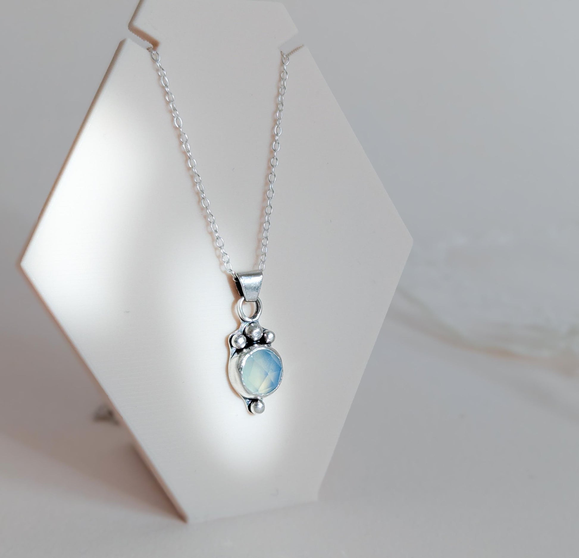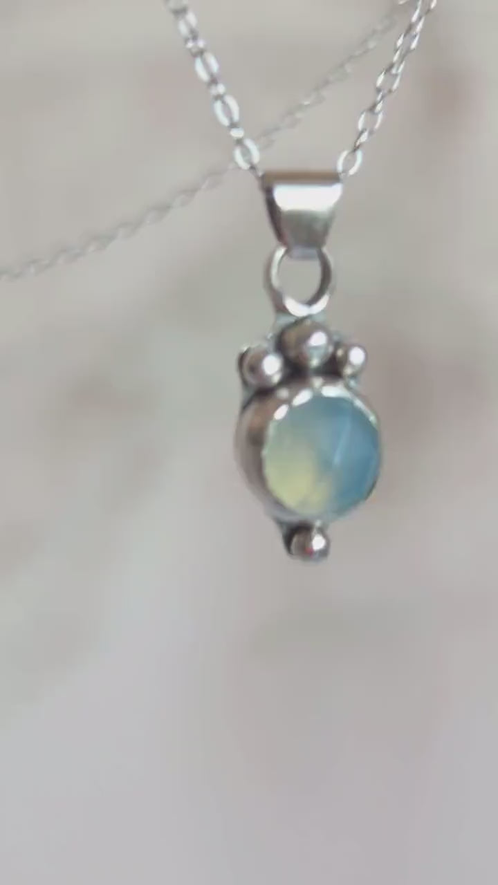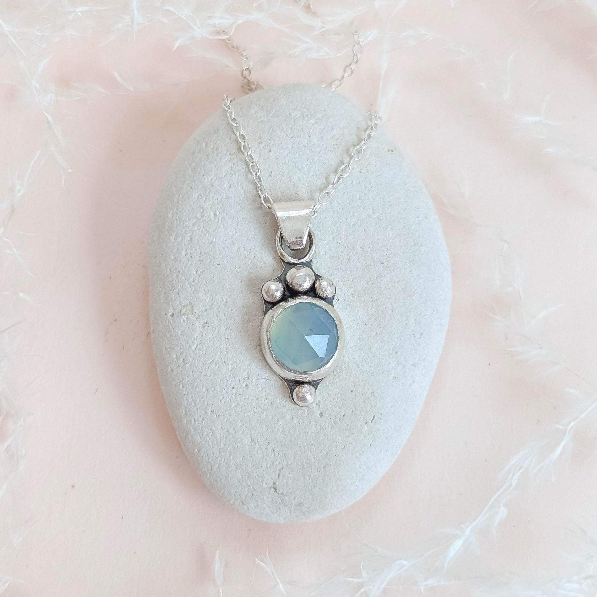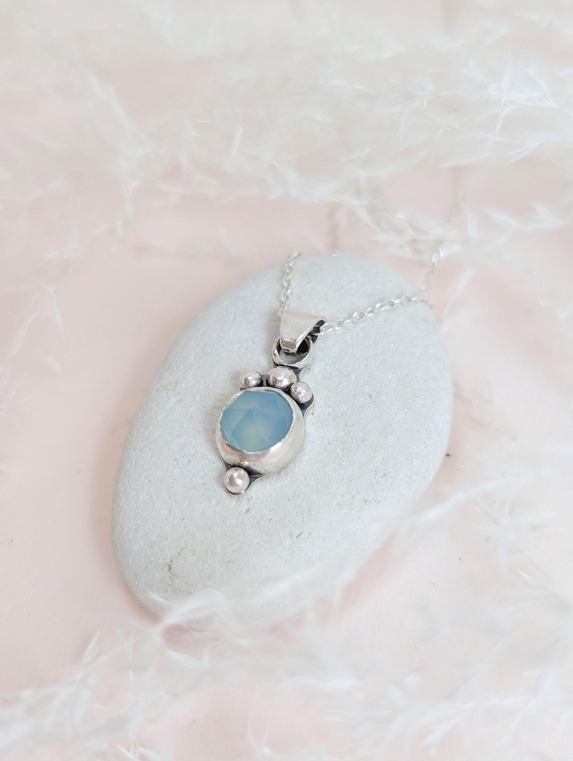 Dainty aqua blue rose cut Chalcedony round stone set in a sterling silver water drop pendant